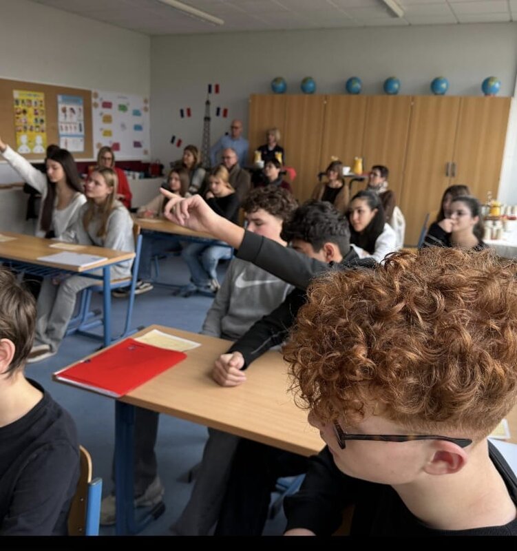 Ein Highlight und sehr passend für unseren französischen Besuch war natürlich unser Bili-Raum, der von uns allen, Schülern und Lehrern, für einen herzlichen Empfang mühevoll vorbereitet wurde. Im Bili-Raum konnte dann der 7er bilinguale E-Kurs in einer Mini-Unterrichtsstunde noch zeigen, was er bereits kann.