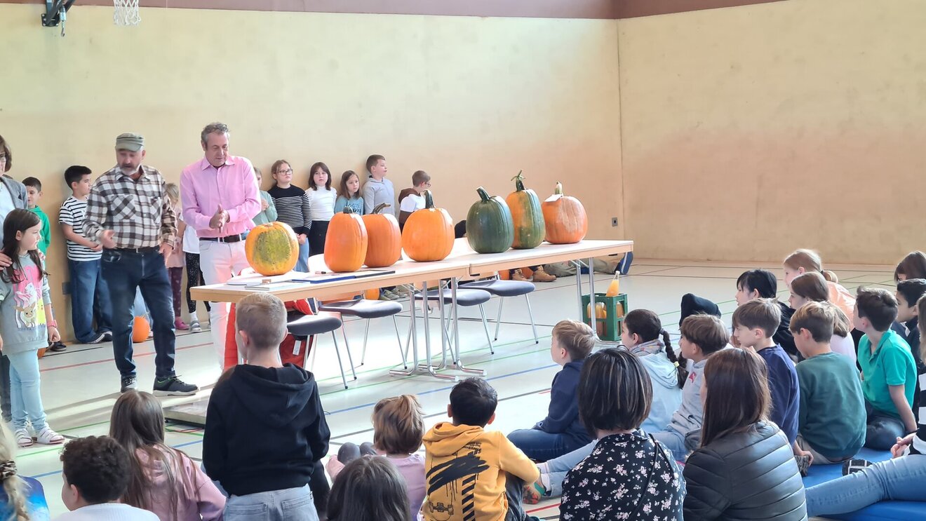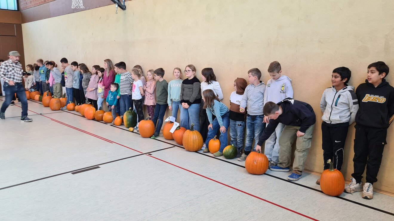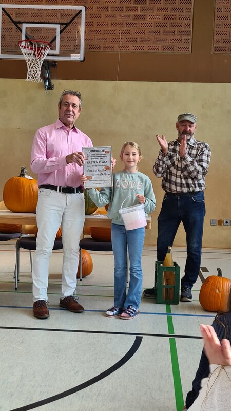 Alle Kürbisse wurden gewogen, und die drei schwersten Exemplare wurden mit einer Urkunde prämiert. Den 1. Platz sicherte sich Elisa Grißmer aus der Klasse 4a mit einem Kürbis, der über 16 Kilogramm auf die Waage brachte – herzlichen Glückwunsch!