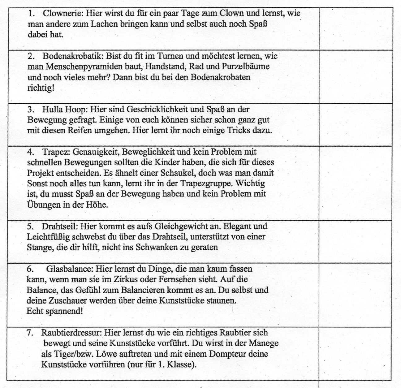 Die Workshops ähneln denen vor vier Jahren. Somit garantiert jeder Akt Spiel, Spaß und Spannung und vor allem ein grandioser Auftritt am Ende unserer Projektwoche "Zirkus".