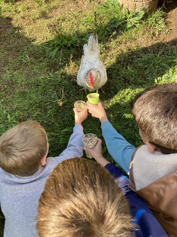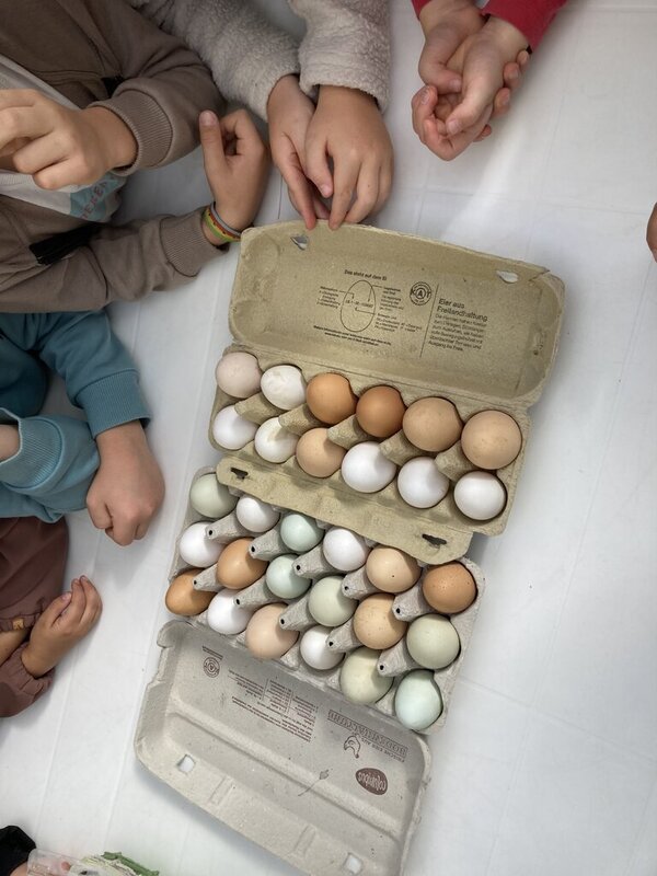 Natürlich durften die Hühner auch gefüttert und sogar gestreichelt werden. Ein weiteres Highlight: Herr Blaes zeigte den Kindern verschiedene natürliche Eierfarben – da gab es einiges zu staunen.