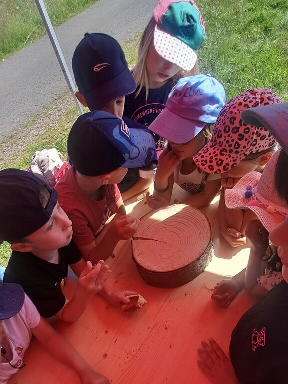 Die Schülerinnen und Schüler untersuchten Baumscheiben und zählten die Jahresringe. Sie erfuhren, wie man anhand der Ringe das Alter eines Baumes bestimmen kann und welche Geschichten die Bäume über die Jahre hinweg erzählen. Zusätzlich lernten die Kinder, welche alltäglichen Gegenstände aus Holz bestehen. Zum Abschluss des Walderlebnistages stand ein Koordinationsspiel „Du bist mein Stuhl“ auf dem Programm. Dabei mussten die Kinder ihre Geschicklichkeit und Teamfähigkeit zeigen. Dieses Spiel sorgte für viel Spaß und Lachen.