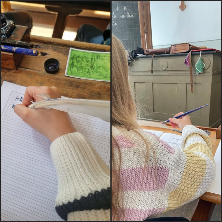 Besonders spannend war auch das Schreiben mit einer Feder und einer Stahlfeder, das die Schüler selbst ausprobieren durften! Zuerst war es gar nicht so leicht, aber nach ein paar Versuchen hatten sie den Dreh raus und es machte viel Spaß.