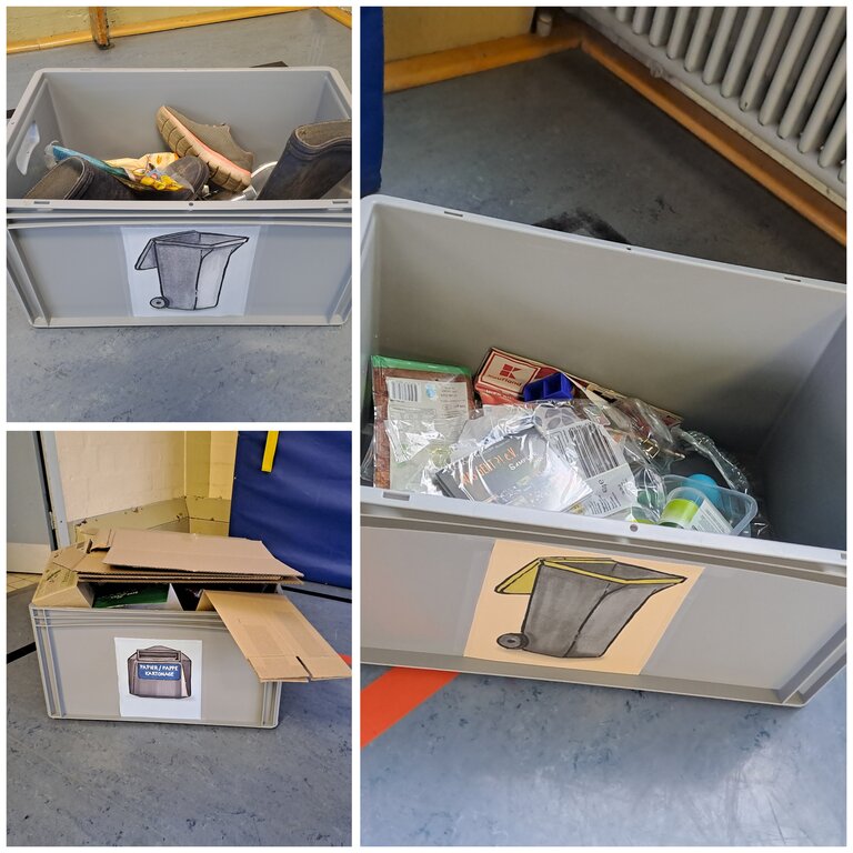 Zu Beginn saßen die Kinder vor einem großen Müllberg. Es wurde geschätzt, wieviel kg Müll jeder Mensch im Jahr produziert. In einem Rollenspiel, einem Spiel zur Mülltrennung sowie einem Müllabfuhrspiel setzten sich die Kinder mit dem Thema auseinander. Die Möglichkeiten zur Mülltrennung wurden abschließend auf einem Plakat festgehalten. Die Kinder hatten sichtlich Spaß und Freude.