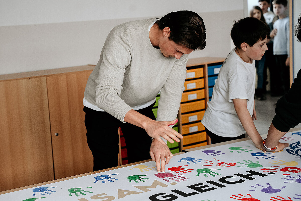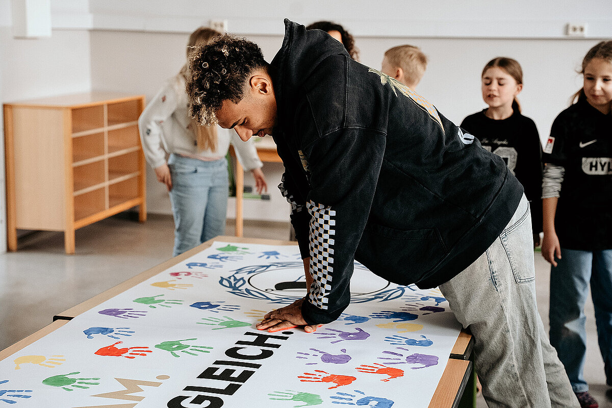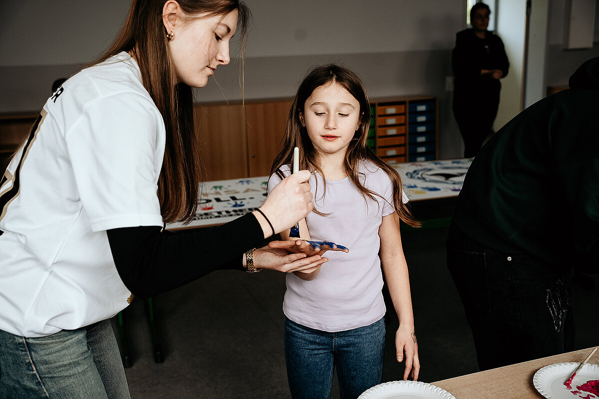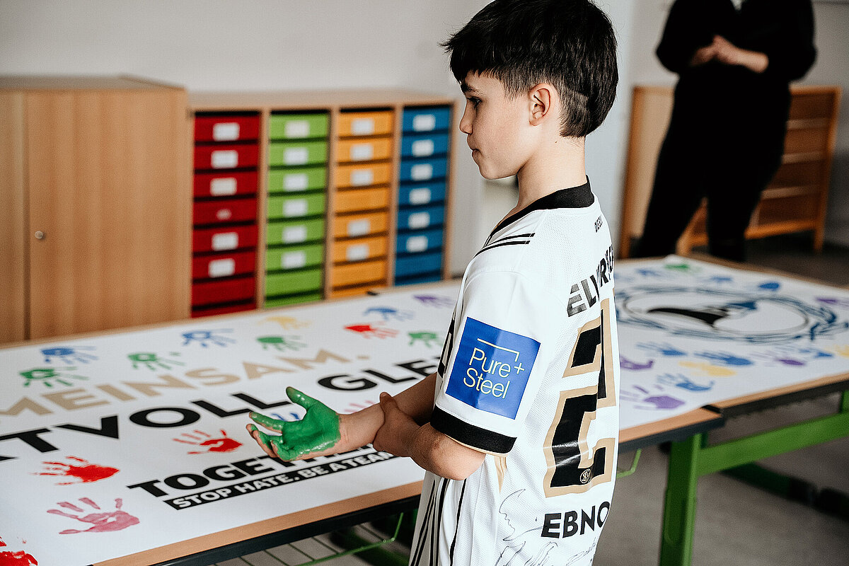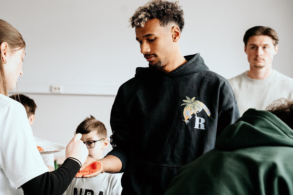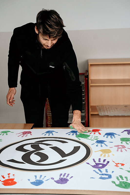 Anschließend gingen wir in den Kunstraum und durften ein Banner der SV Elversberg mit unserem Handabdruck bunt gestalten. Am Ende des Tages durften wir noch auf den Schulhof gehen. Maxi Rohr kam auch dazu. Wir haben ihn gefragt, ob er Radschlagen kann und ob er es uns zeigen kann. Dann hat er wirklich ein Rad geschlagen. Es war zwar etwas schief und krumm, aber er hat sich getraut.