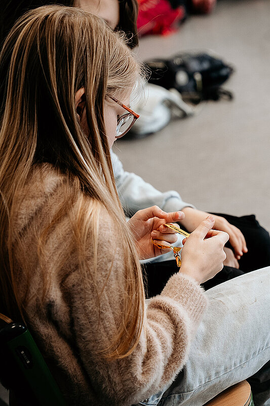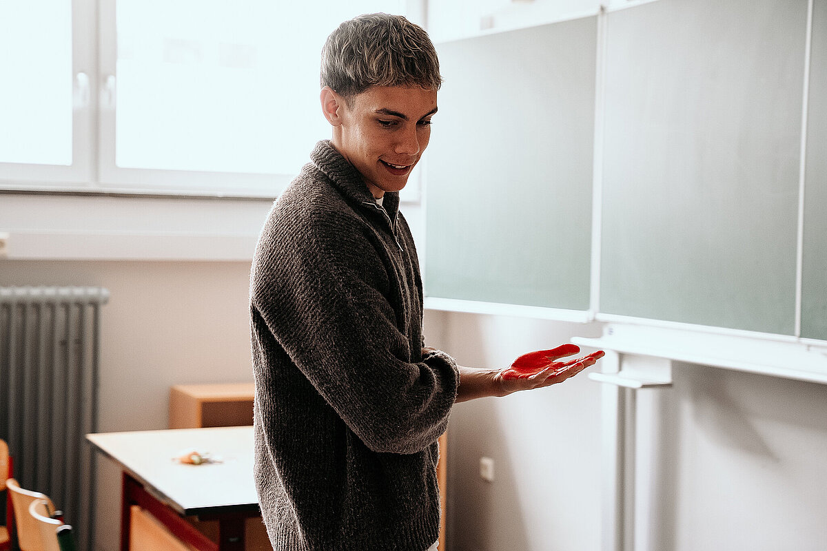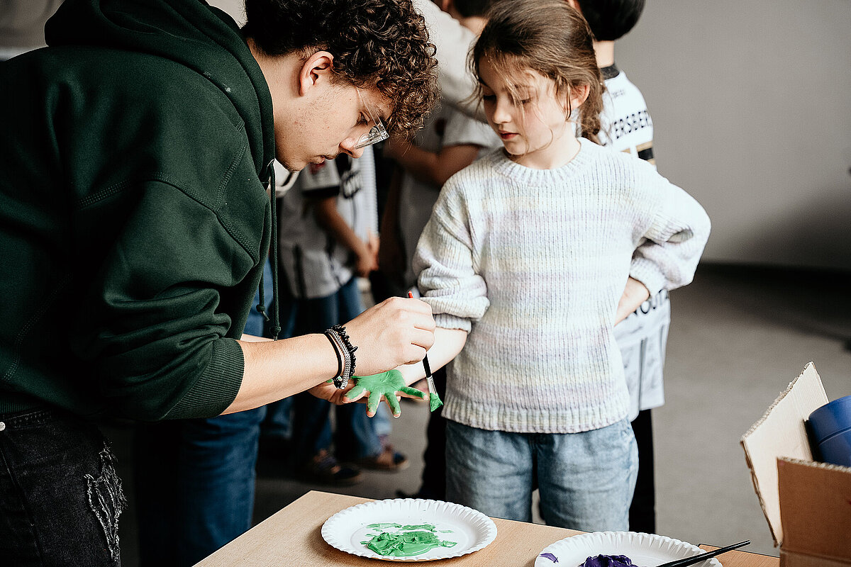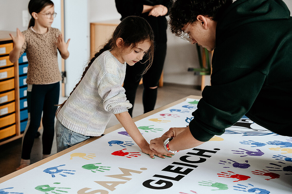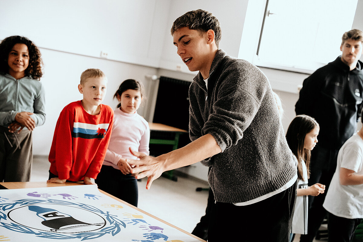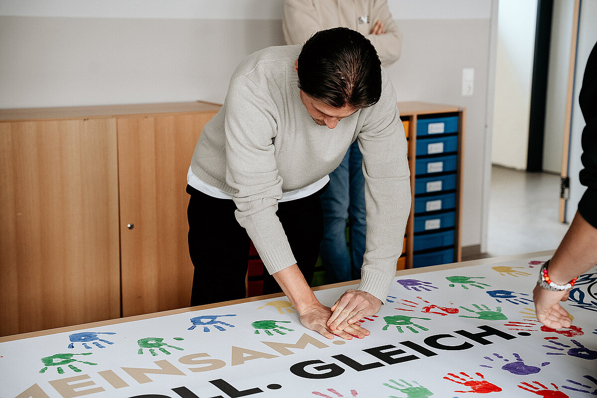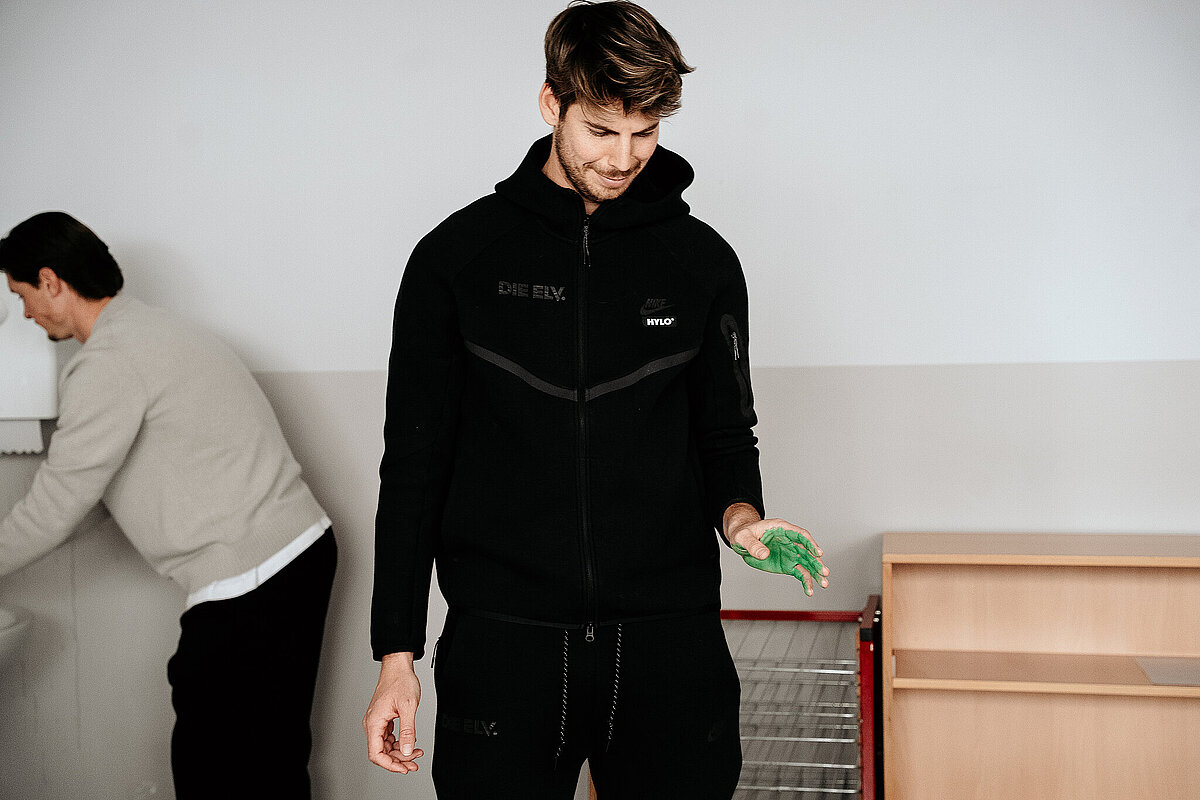 Anschließend gingen wir in den Kunstraum und durften ein Banner der SV Elversberg mit unserem Handabdruck bunt gestalten. Am Ende des Tages durften wir noch auf den Schulhof gehen. Maxi Rohr kam auch dazu. Wir haben ihn gefragt, ob er Radschlagen kann und ob er es uns zeigen kann. Dann hat er wirklich ein Rad geschlagen. Es war zwar etwas schief und krumm, aber er hat sich getraut.