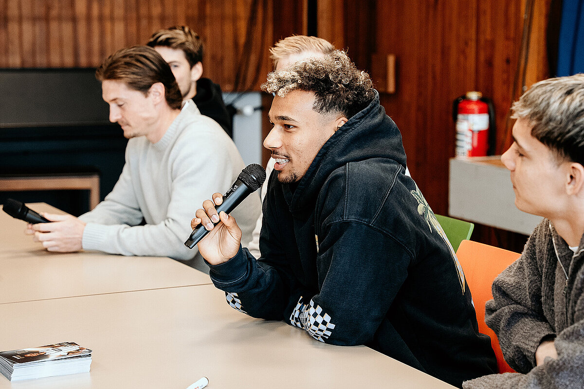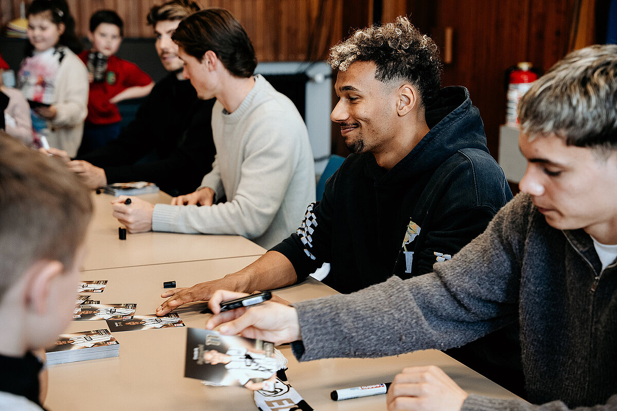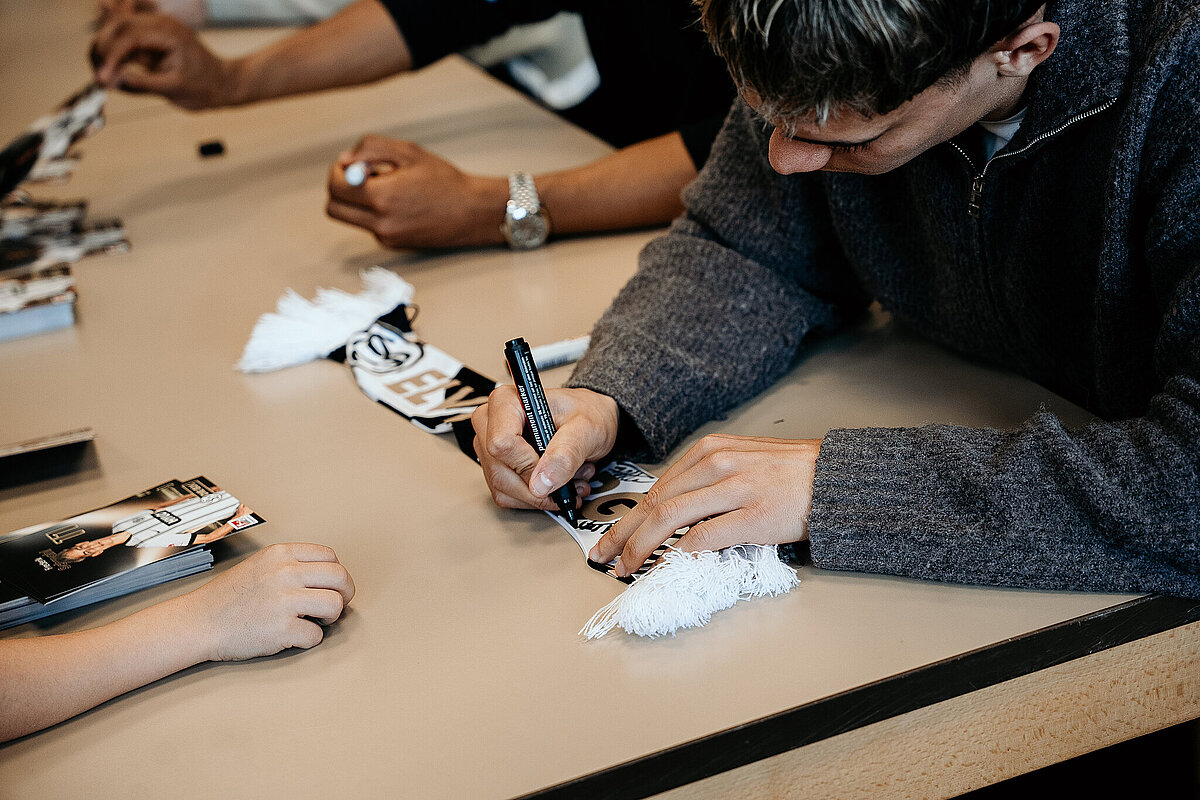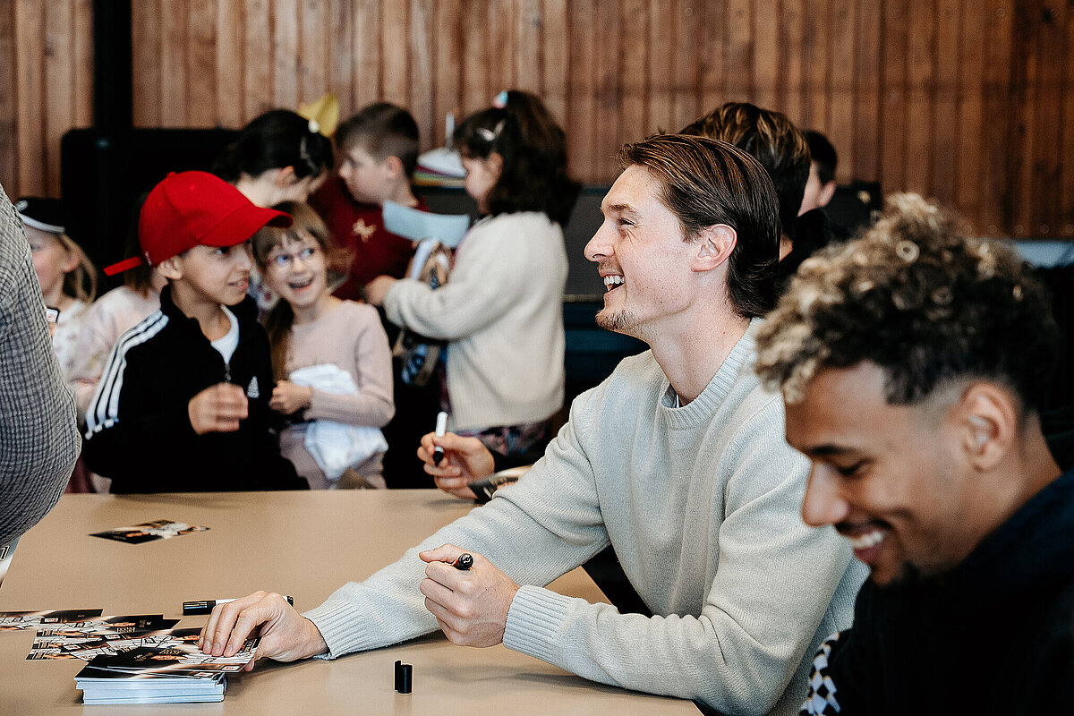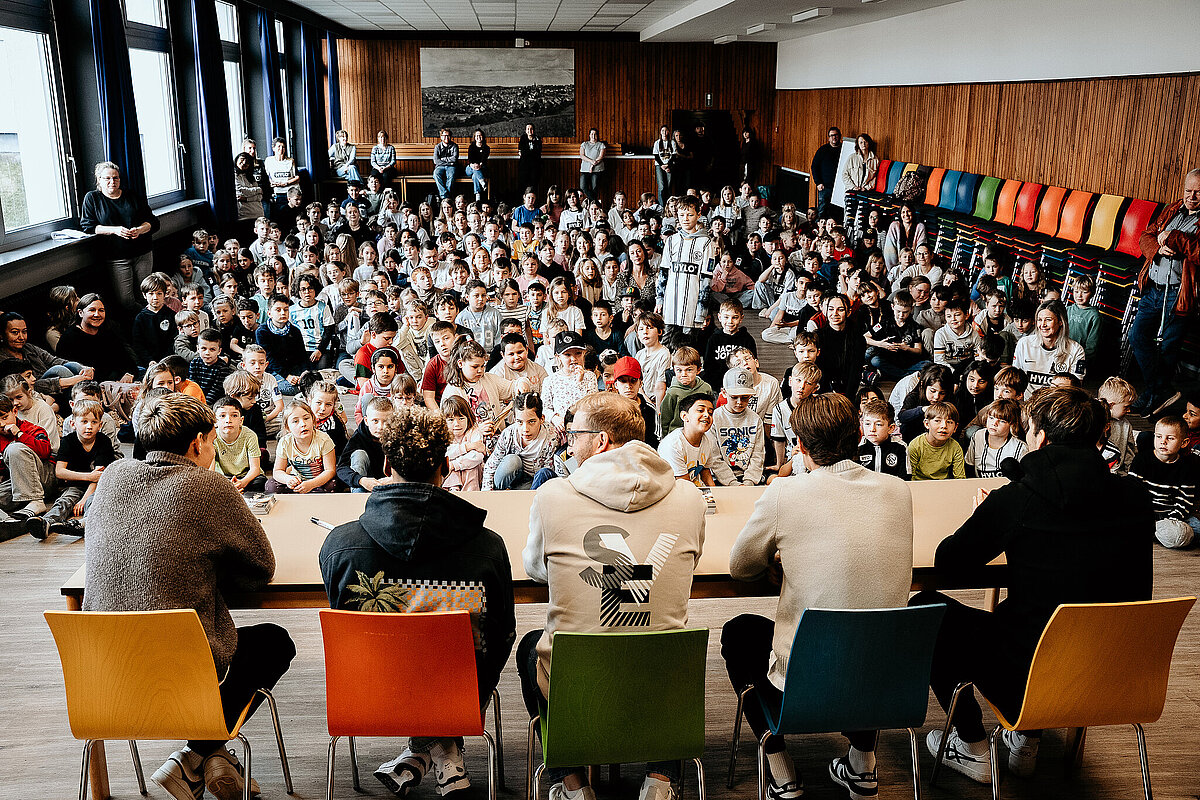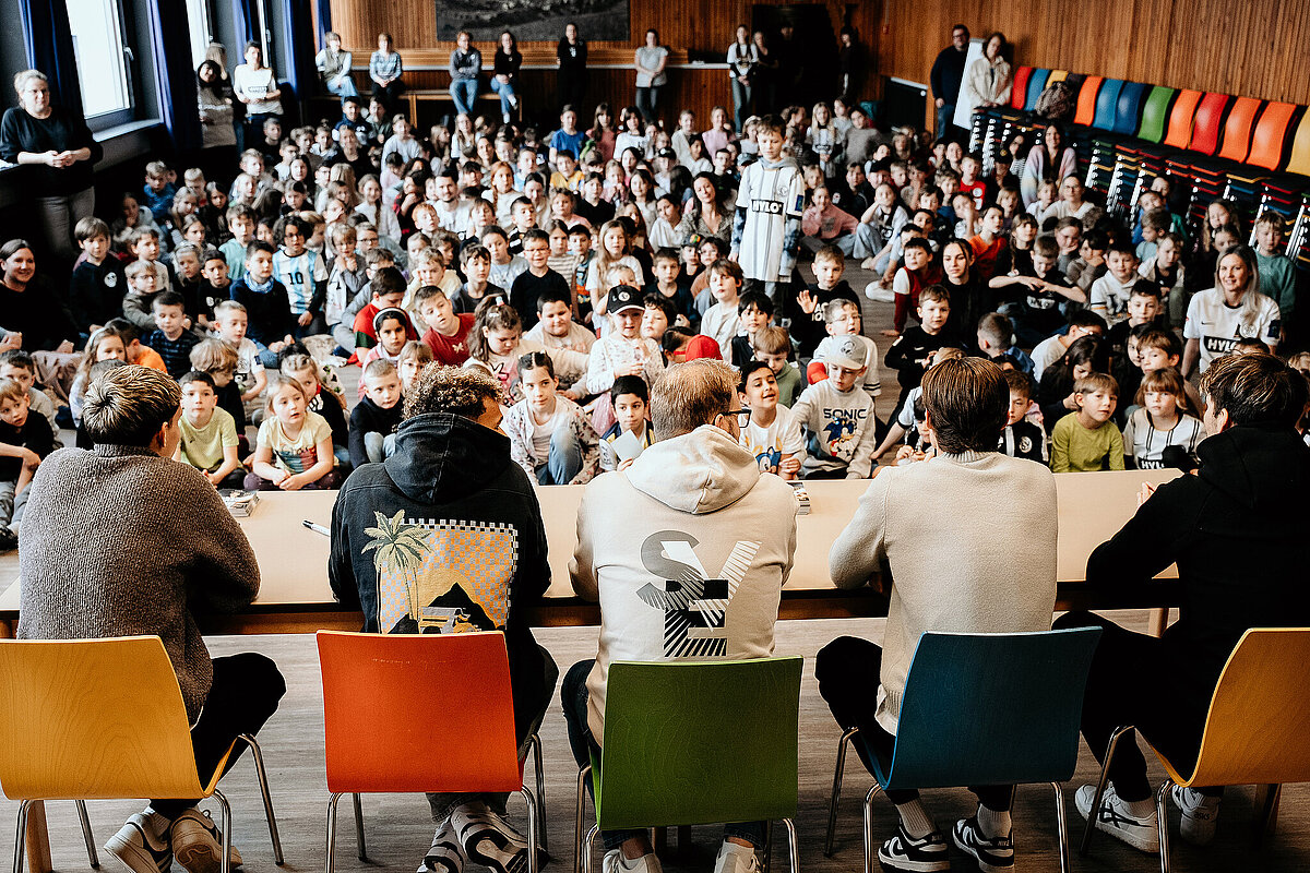 Als wir damit fertig waren, ging die ganze Klasse durch einen Geheimgang auf die Aula-Bühne. Dort haben wir das Lied „What about us“ vor der ganzen Schule und den Spielern der SV Elversberg gesungen. Das war sehr aufregend. Nach unserem Auftritt ging es weiter mit einer Pressekonferenz, bei der wir den Fußballspielern Frederik Schmahl, Maxi Rohr, Bambasé Conté und Carlo Sickinger Fragen stellen durften. Dazu reichte unser Schulsprecher Ben Gehring den Kindern das Mikrofon. Ich durfte auch eine Frage stellen. Ich wollte wissen, welche die schlimmste Verletzung der Spieler beim Fußballspielen war. Maxi sagte zum Beispiel, dass seine schlimmste Verletzung ein Schlüsselbeinbruch war. Auf der Pressekonferenz haben wir auch Maxis Hund Cleo kennengelernt, einen Golden Retriever. Alle, die wollten, durften ihn abwechselnd streicheln. Danach gab es noch eine Autogrammstunde. Frederik hatte leider nicht genug Autogrammkarten dabei, da haben sich einige Kinder das T-Shirt unterschreiben lassen.