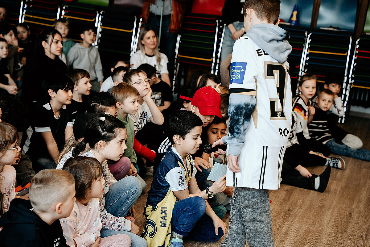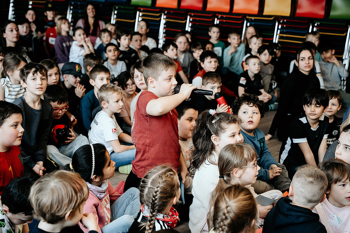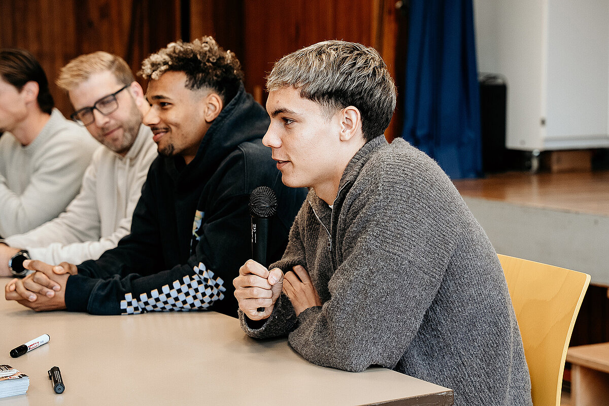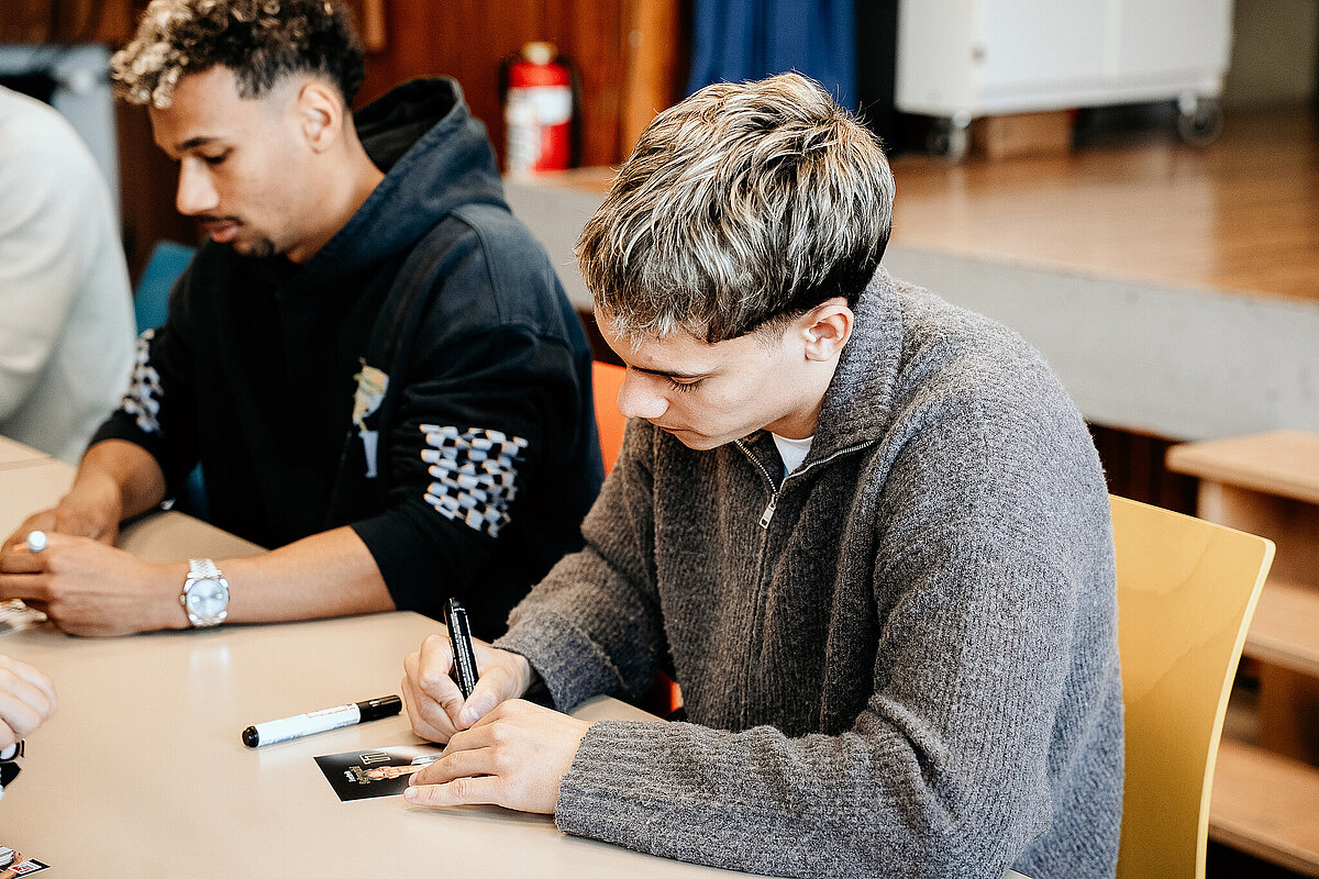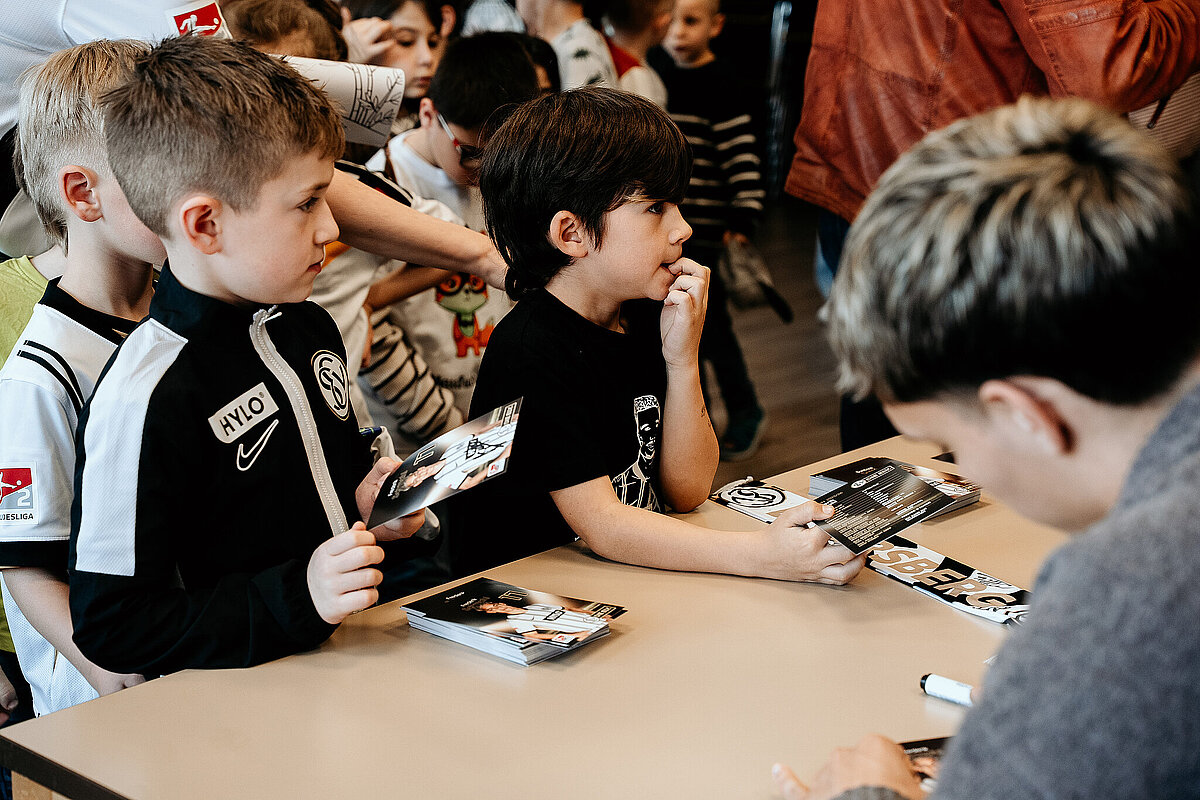 Als wir damit fertig waren, ging die ganze Klasse durch einen Geheimgang auf die Aula-Bühne. Dort haben wir das Lied „What about us“ vor der ganzen Schule und den Spielern der SV Elversberg gesungen. Das war sehr aufregend. Nach unserem Auftritt ging es weiter mit einer Pressekonferenz, bei der wir den Fußballspielern Frederik Schmahl, Maxi Rohr, Bambasé Conté und Carlo Sickinger Fragen stellen durften. Dazu reichte unser Schulsprecher Ben Gehring den Kindern das Mikrofon. Ich durfte auch eine Frage stellen. Ich wollte wissen, welche die schlimmste Verletzung der Spieler beim Fußballspielen war. Maxi sagte zum Beispiel, dass seine schlimmste Verletzung ein Schlüsselbeinbruch war. Auf der Pressekonferenz haben wir auch Maxis Hund Cleo kennengelernt, einen Golden Retriever. Alle, die wollten, durften ihn abwechselnd streicheln. Danach gab es noch eine Autogrammstunde. Frederik hatte leider nicht genug Autogrammkarten dabei, da haben sich einige Kinder das T-Shirt unterschreiben lassen.