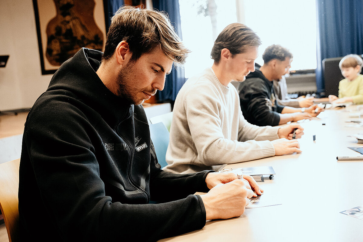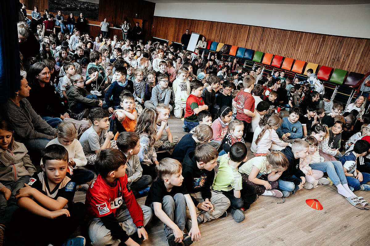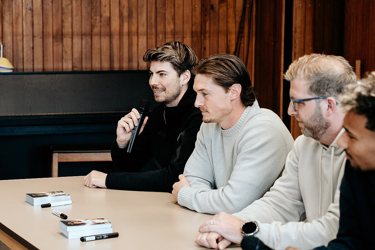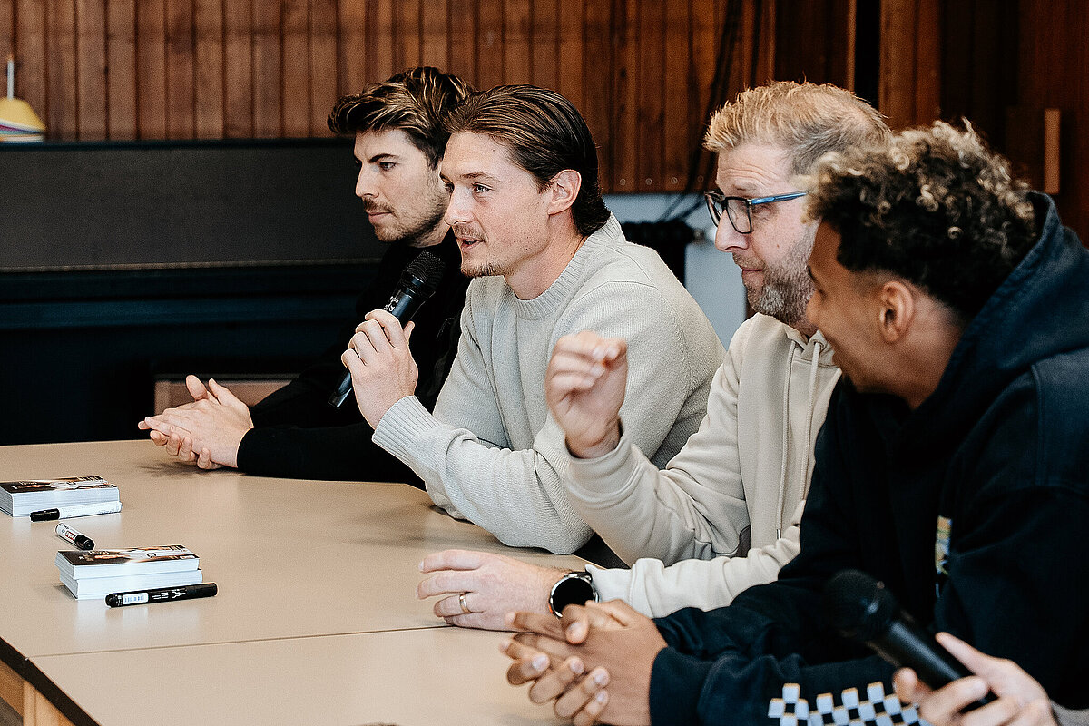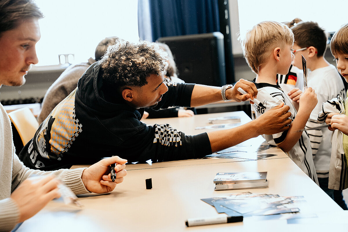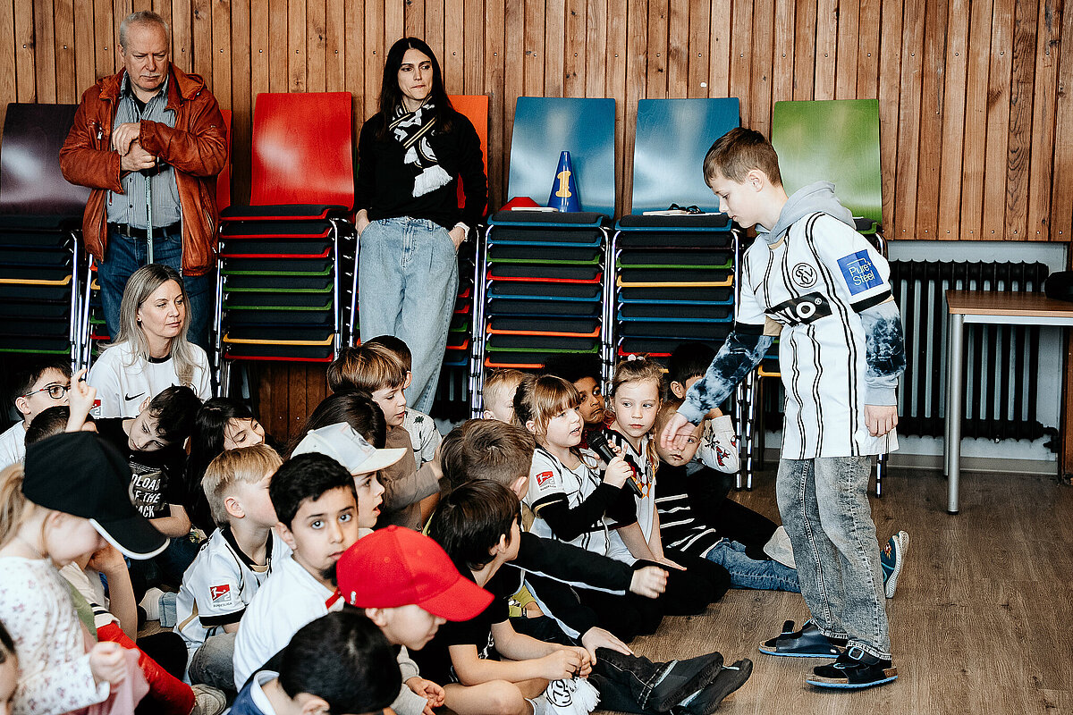 Als wir damit fertig waren, ging die ganze Klasse durch einen Geheimgang auf die Aula-Bühne. Dort haben wir das Lied „What about us“ vor der ganzen Schule und den Spielern der SV Elversberg gesungen. Das war sehr aufregend. Nach unserem Auftritt ging es weiter mit einer Pressekonferenz, bei der wir den Fußballspielern Frederik Schmahl, Maxi Rohr, Bambasé Conté und Carlo Sickinger Fragen stellen durften. Dazu reichte unser Schulsprecher Ben Gehring den Kindern das Mikrofon. Ich durfte auch eine Frage stellen. Ich wollte wissen, welche die schlimmste Verletzung der Spieler beim Fußballspielen war. Maxi sagte zum Beispiel, dass seine schlimmste Verletzung ein Schlüsselbeinbruch war. Auf der Pressekonferenz haben wir auch Maxis Hund Cleo kennengelernt, einen Golden Retriever. Alle, die wollten, durften ihn abwechselnd streicheln. Danach gab es noch eine Autogrammstunde. Frederik hatte leider nicht genug Autogrammkarten dabei, da haben sich einige Kinder das T-Shirt unterschreiben lassen.