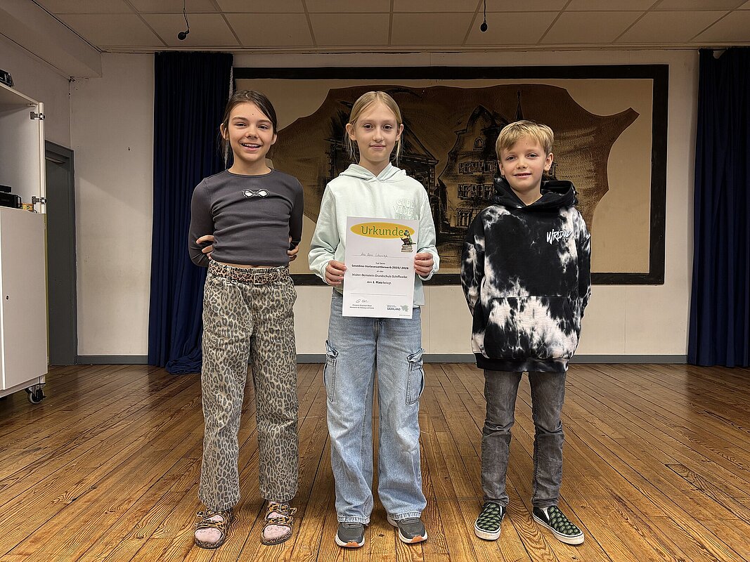 Am Montag, dem 26. Januar, wurde aus den Klassensiegern der Klassen 4a, 4b und 4c der Schulsieger ermittelt. Die zwei besten Vorleser der drei vierten Klassen lasen der Jury (Schulleiter Björn Denne, stellvertretende Schulleiterin Frau Rheinheimer, den Klassenlehrerinnen Frau Steuer und Frau Baus) ein geübtes Lesestück sowie einen unbekannten Text vor. Schließlich setzte sich Anna Lukasczyk aus der Klasse 4a durch und wurde zur Schulsiegerin gewählt. Die drei besten Vorleser, Anna Lukasczyk (1. Platz), Lasse Ningel (2. Platz) und Anni Dörrenbecher (3. Platz) erhielten jeweils einen Buchgutschein (30 Euro, 20 Euro, 15 Euro), der dankenswerterweise vom Förderverein gestiftet wurde.