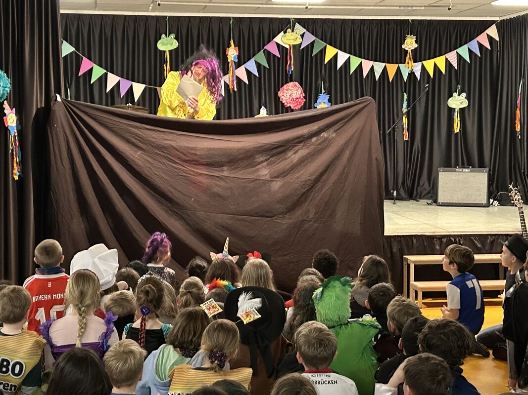 Anschließend ging es zur großen offiziellen Feier in der Aula. Traditionell startete alles mit einer fröhlichen Polonaise durchs Schulhaus, bevor ein vielfältiges Programm aus Gesang, Tanz, Büttenrede, Witzen und vielem mehr folgte.