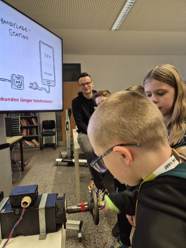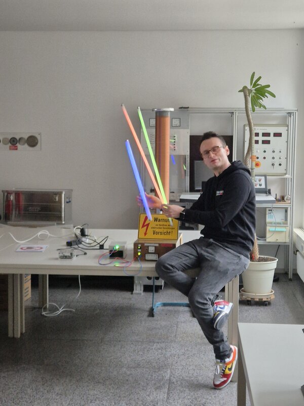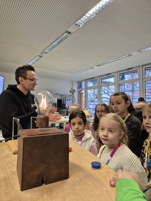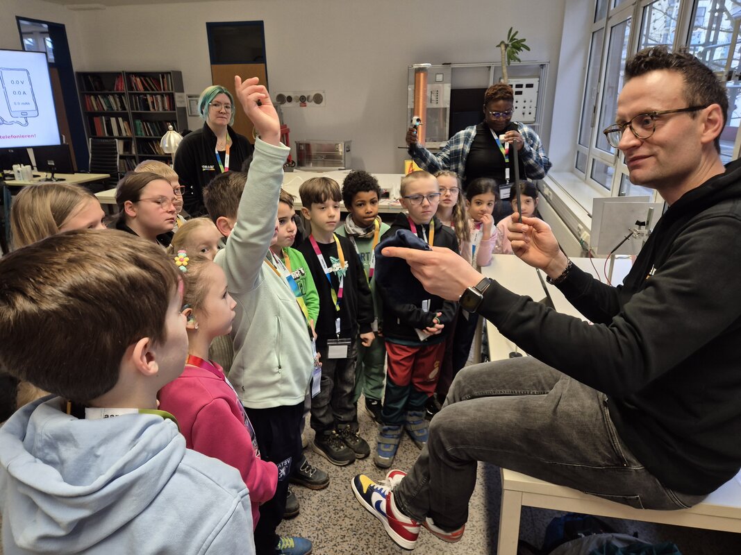 Als Erstes ging es um das Thema Elektrizität! Deshalb durften wir erstmal bei einem Dozenten der Uni lernen, was Strom überhaupt ist, was Strom kann und wie man Strom erzeugen kann. Auch kleine Blitze wurden erzeugt, und mit einem Blitze-Musik-Gerät wurde unserem Geburtstagskind Oliver sogar ein Geburtstagsständchen vorgespielt! Toll!