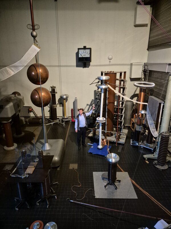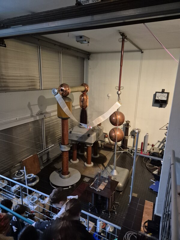 Für die großen Blitze begaben wir uns dann in einen großen Elektroraum, wo mehrfach Hochspannungsblitze in eine riesige Anlage einschlugen! Das hat ganz schön laut gescheppert! Ein anderer Dozent der Uni erklärte uns dabei, wie in der Natur Blitze entstehen, und wie man sich davor schützen kann. (Auch wir waren natürlich durch einen blitzesicheren Käfig vor den Blitzen geschützt.)