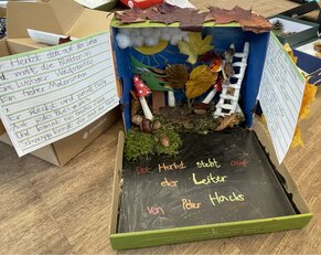 Die Klasse 2a beschäftigte sich eine Woche lang mit dem Gedicht „Der Herbst steht auf der Leiter“ von Peter Hacks. Neben dem klassischen Auswendiglernen mit anschließendem Gedichtvortrag und vielfältigen Schreibübungen durften die Kinder auch kreativ werden. Jedes Kind sollte eine Kiste mit Gegenständen, Bildern, etc., die zum Inhalt des Gedichtes passen, gestalten. Hierbei waren der Kreativität keine Grenzen gesetzt, wie sich in den tollen Ergebnissen zeigt.