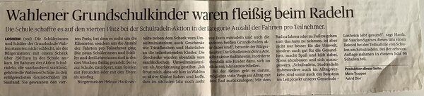 Im Rahmen der Aktion Schulradeln, die vom 1. bis 21. Juni saarlandweit stattfand, gehörte die Grundschule Wahlen zu den erfolgreichsten Grundschulen im Saarland. Bei dem 4. Preis, den sie erlangen konnten, ging es gar nicht um die Kilometer, sondern um die Anzahl der Fahrten pro Teilnehmer. Die 9 Schülerinnen und Schüler und 3 Lehrerinnen sind in den 3 Wochen fleißig geradelt. Sei es zur Schule, zum Sport, zum Spielen mit Freunden oder mit den Eltern als Ausflug in der näheren Umgebung.