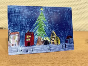 Große Freude an unserer Schule: Die Weihnachtskarte der Stadt Homburg wurde in diesem Jahr von Livia Keller aus der 3. Klasse gestaltet. Mit viel Fantasie und Liebe zum Detail entstand ein stimmungsvolles weihnachtliches Motiv, das die Weihnachtsgrüße der Schule begleitet.